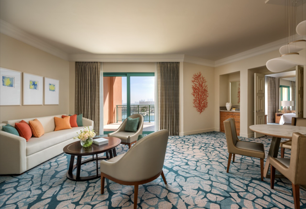 The suite features a spacious living and dining area, perfectly designed for families. With abundant room for everyone to spread out and relax, it creates a warm and welcoming atmosphere that encourages quality time and memorable moments together.