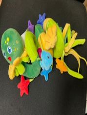 BABY COT WITH MOBILE TOY HANGING FROM UPPER EDGE OF COT FOR A SENSORY JOURNEY PLUSH TOY IN THE COT IN THE SHAPE OF A SOFT JELLYFISH.
