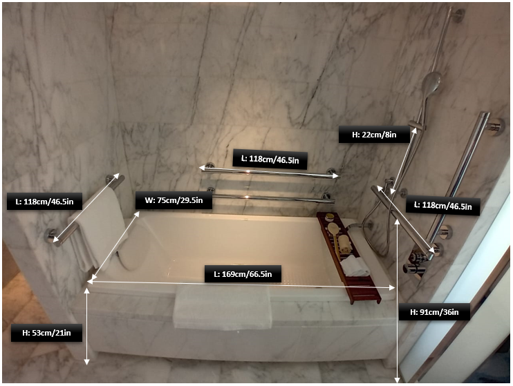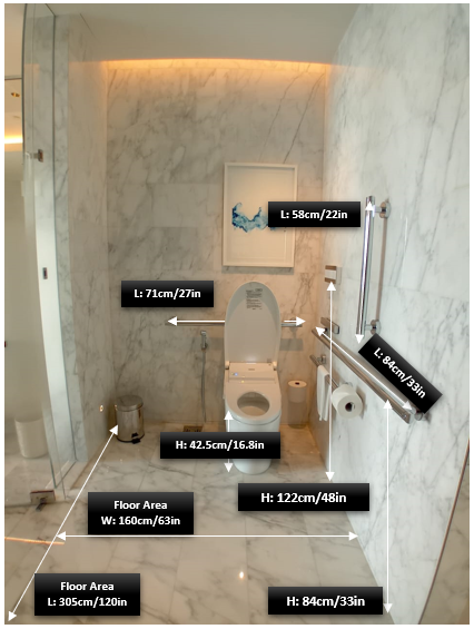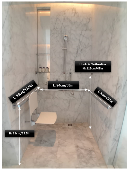 Easy Access Bathtub Larger Shower Area Space Supporting handle / Handrails in the shower and toilet Small Chair only, No Sofa as gives more space |